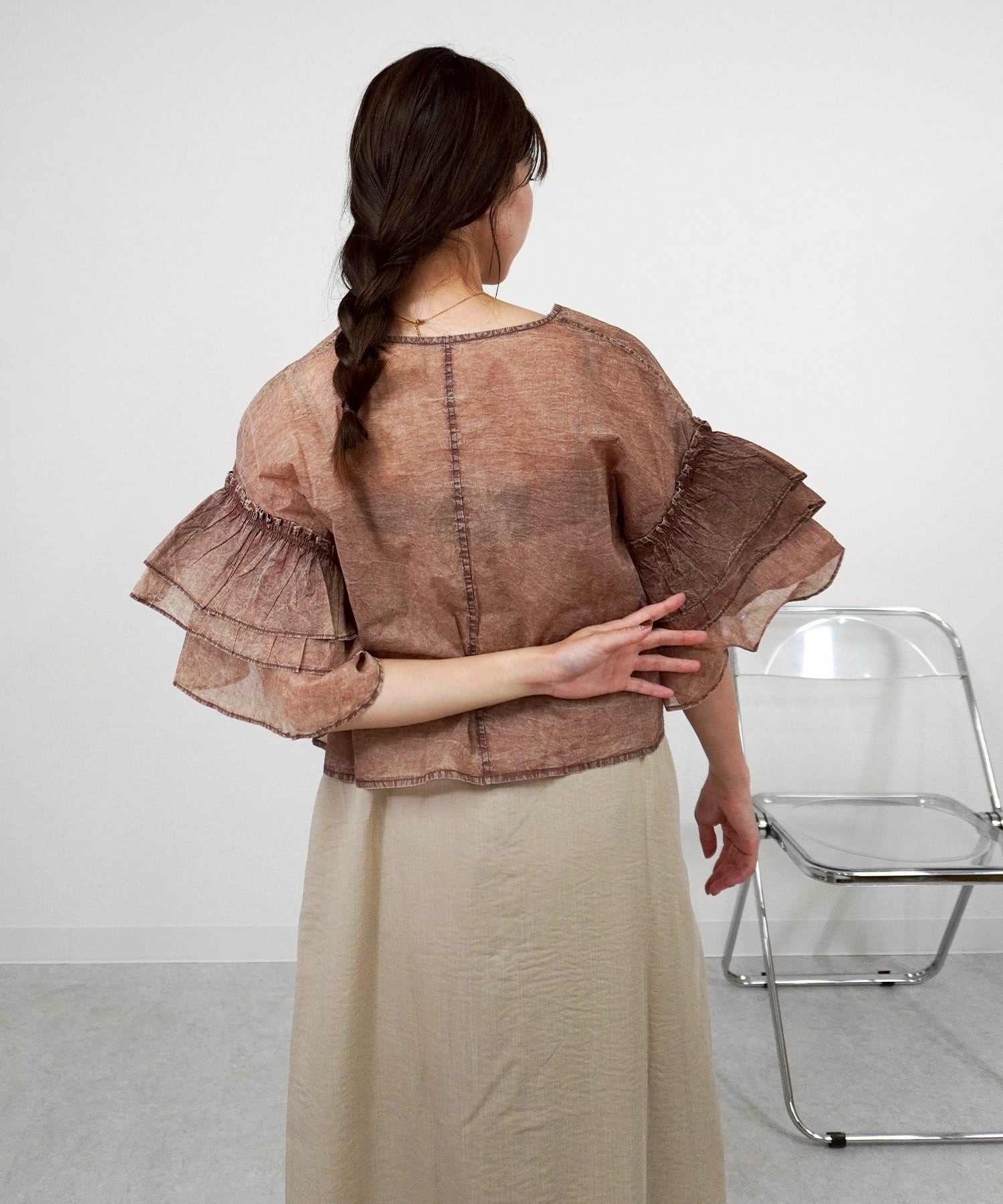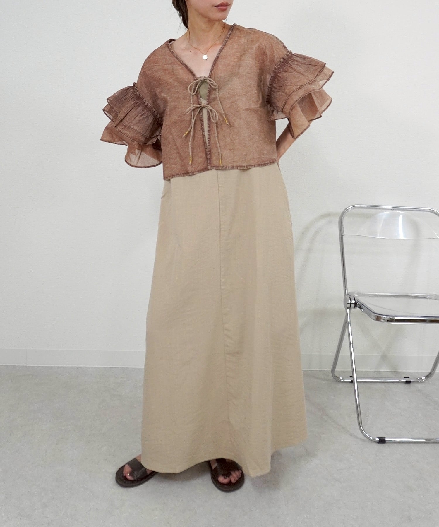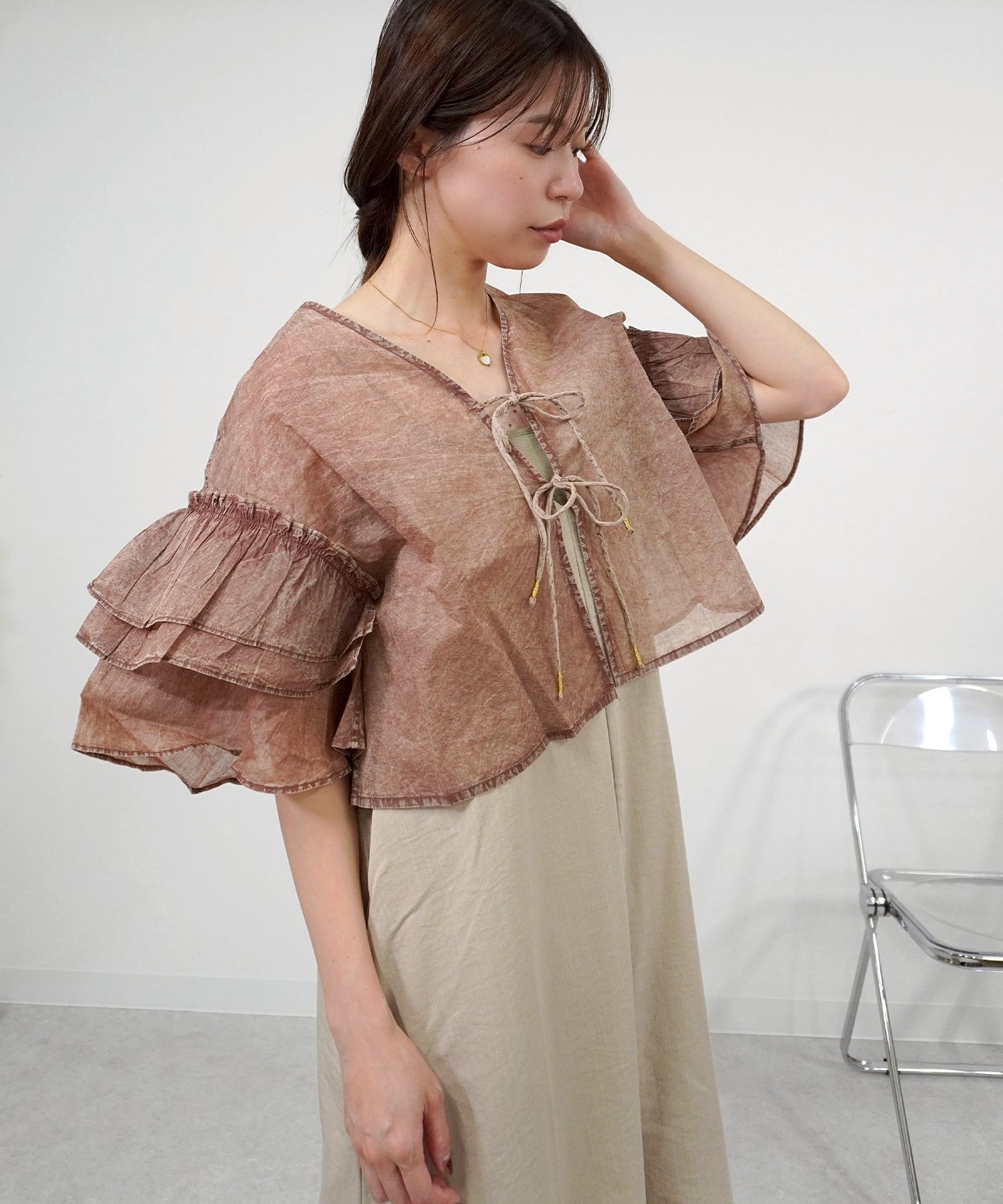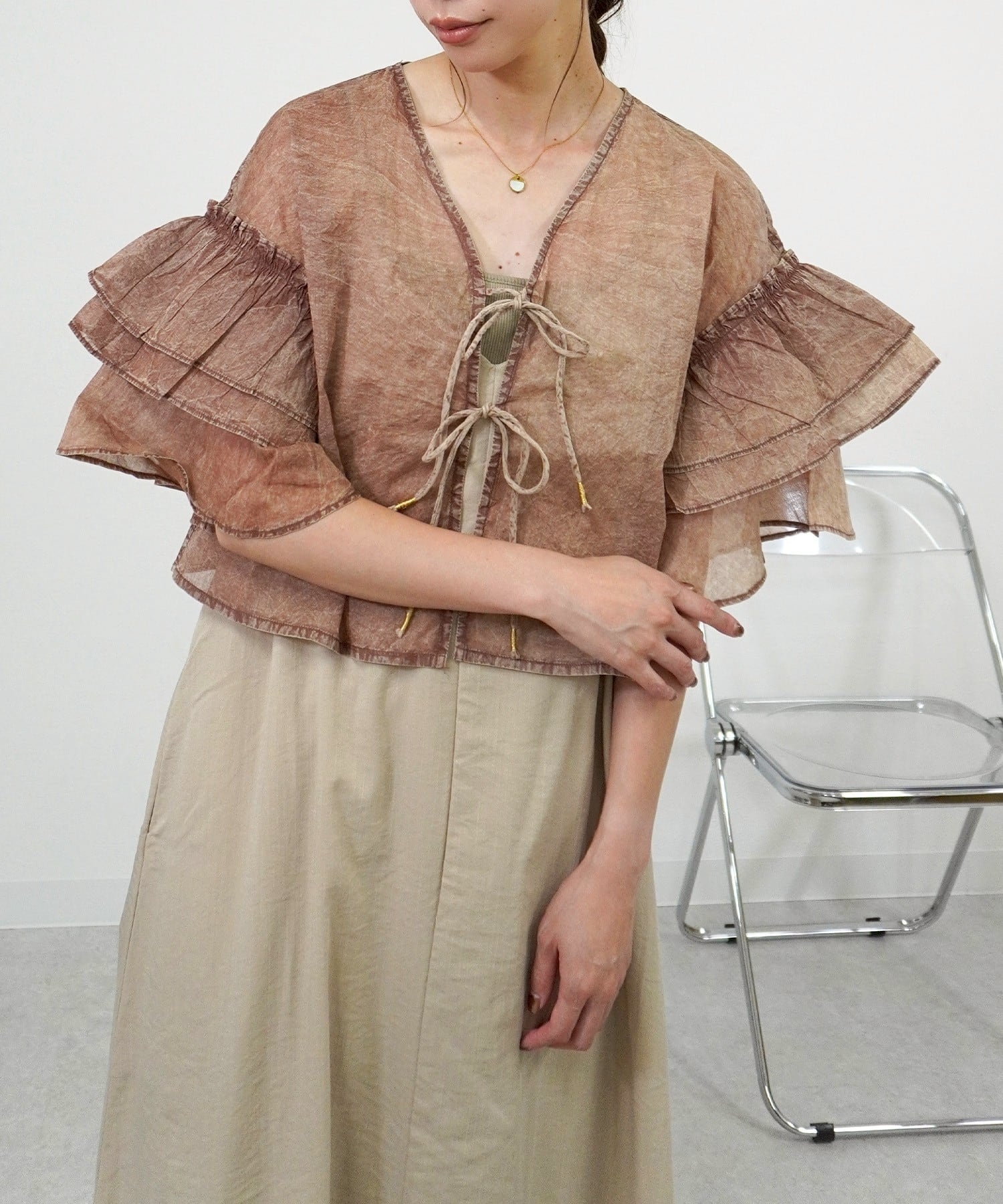 ケミカルウォッシュフリルCD 5055039は、独特なケミカルウォッシュ加工が施されたデニム素材のフリルカーディガンです。