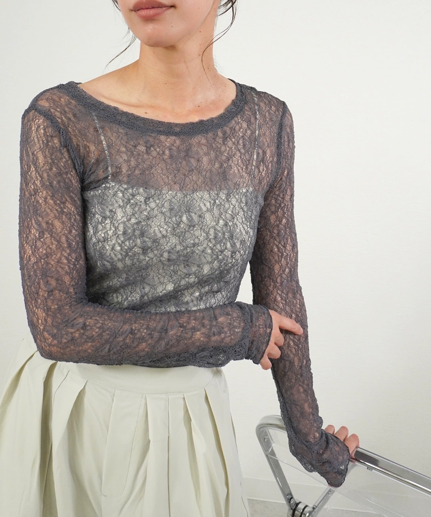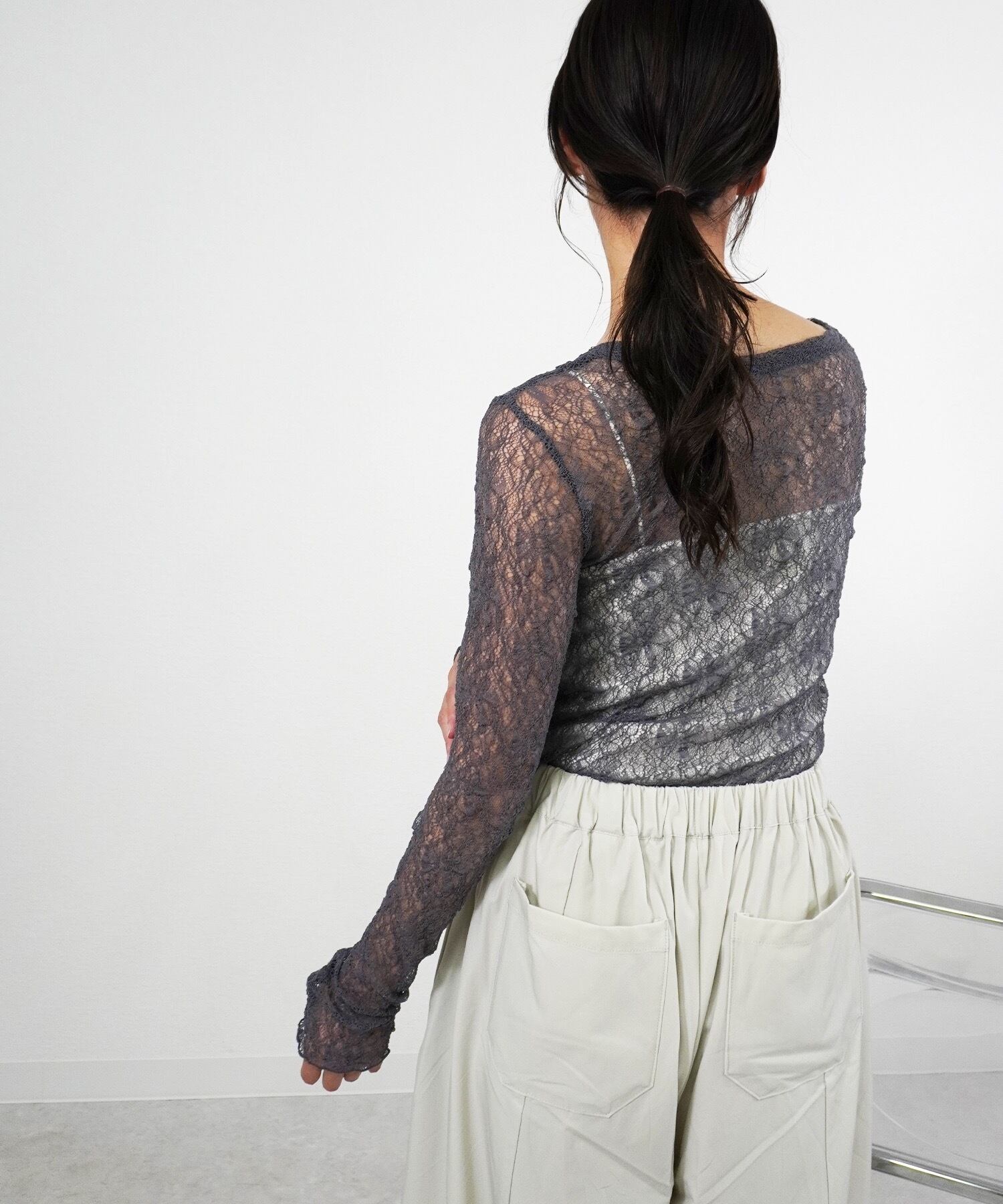 ストレッチレースクルーネックPO 5144893は、伸縮性があり着心地抜群のストレッチレース素材を使用したプルオーバーです!