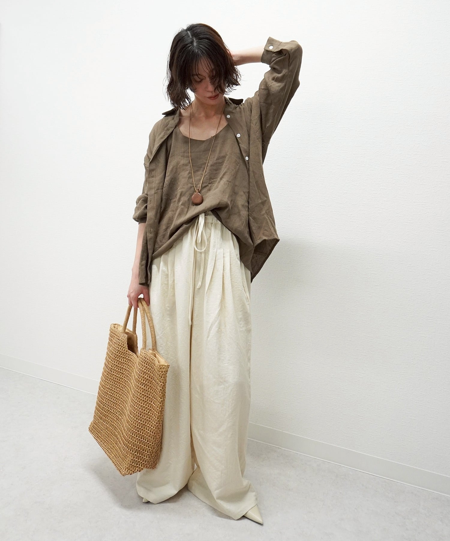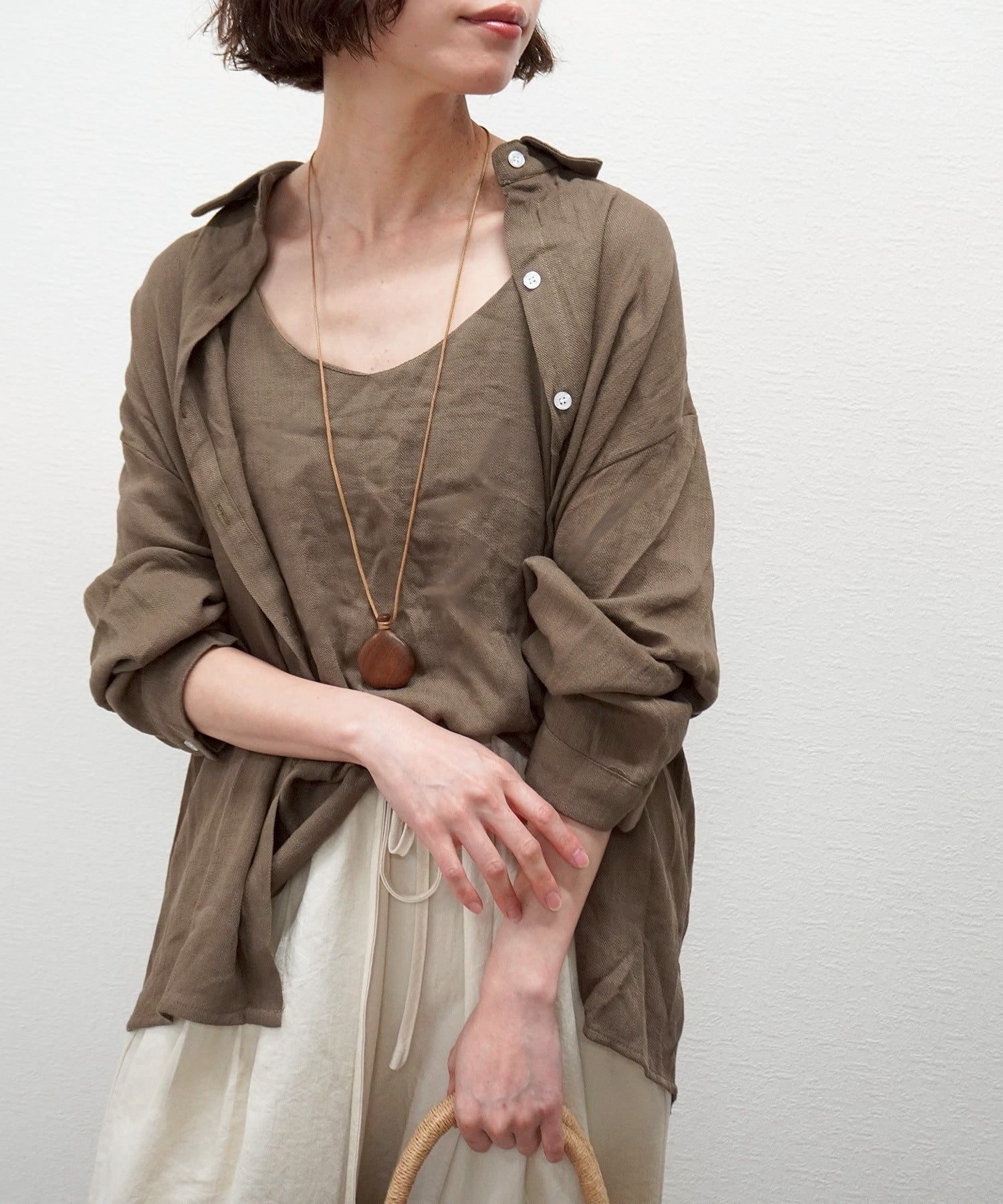 やわらかなリネンタッチが魅力のキャミ付きシャツ!軽やかで通気性に優れた素材感は、デイリーユースからリラックスしたお出かけまで幅広いシーンでお楽しみいただけます。キャミソールがついているデザインは、レイヤードスタイルにぴったりで、一枚でコーディネートが完成する優れもの!シンプルながらも洗練された印象を与え、どんなボトムスとも合わせやすいのが特徴です。季節を問わず活躍できるこのシャツは、毎日のスタイリングに欠かせないアイテムとしておすすめです!あなたのワードローブにぜひ加えてください!